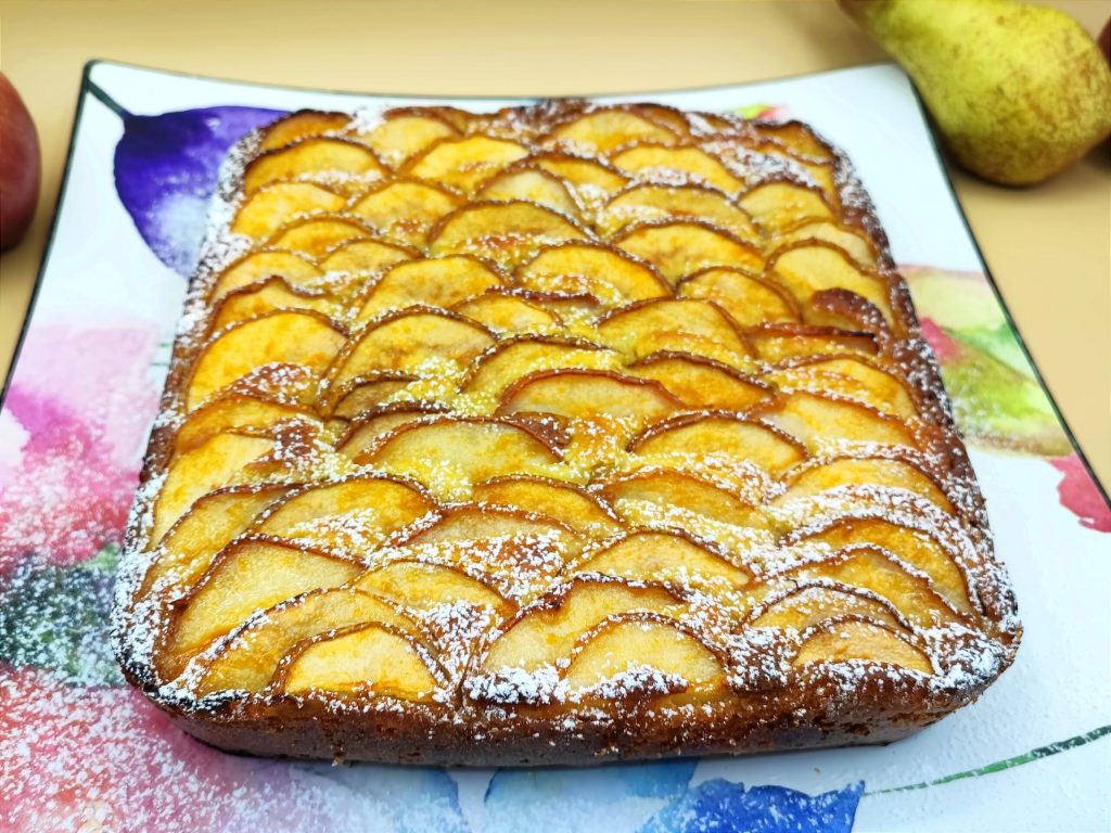 De gegoten taart met peren en jam blijft 3/4 dagen goed in een glazen doos!