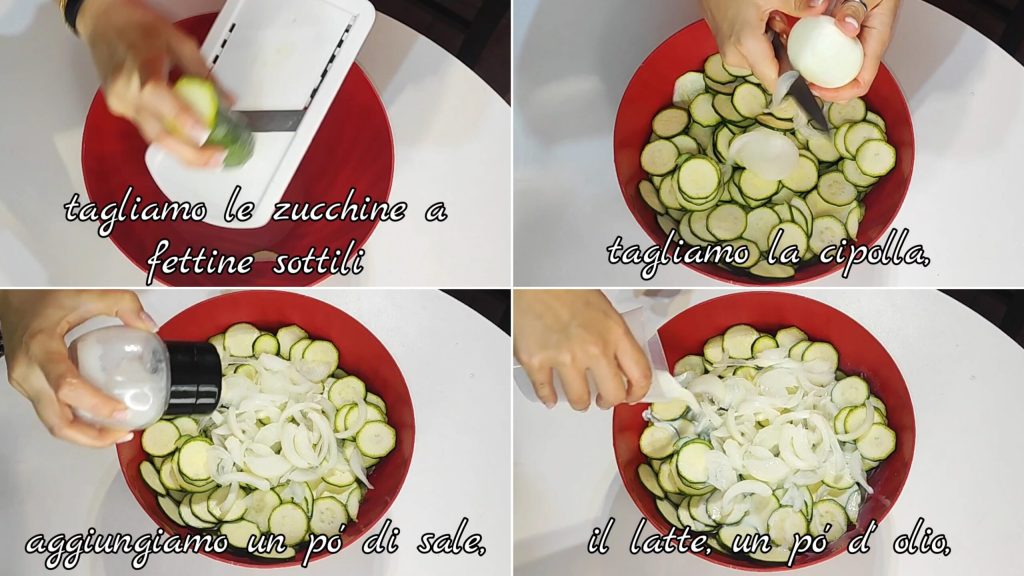 Was, reinig en snijd de courgettes in dunne plakjes (ik gebruikte een mandoline rasp). Voeg de gesneden ui, een beetje zout, de melk en een beetje olie toe.