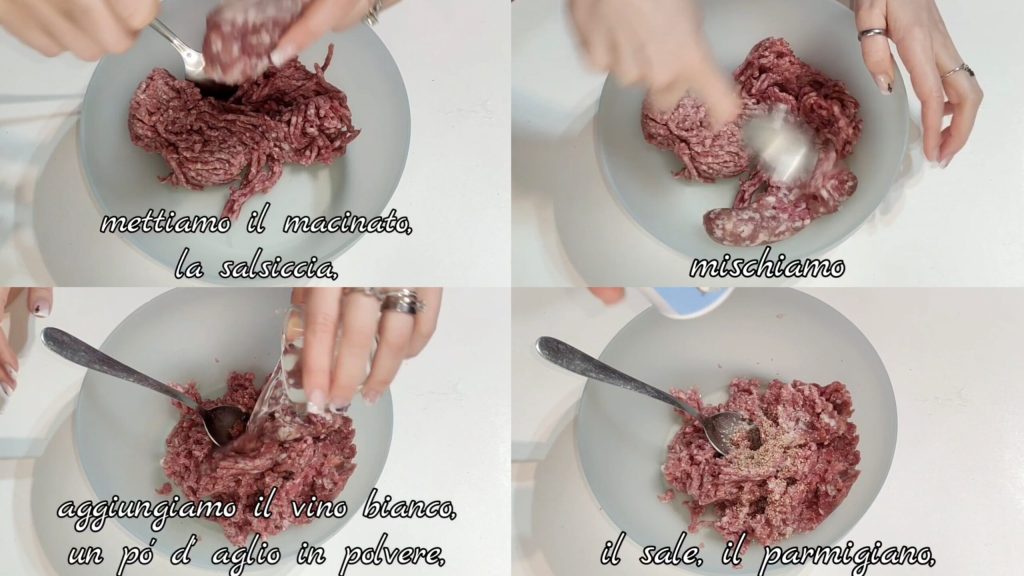 • In een kom doen we het gehakt, de worst en mengen. We voegen de witte wijn toe, een beetje knoflookpoeder, een beetje zout, de Parmezaanse kaas.