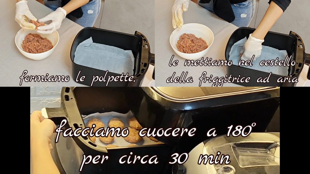 We nemen telkens een beetje van het mengsel en vormen met de handen kleine balletjes. We drukken ze lichtjes plat en plaatsen ze in de mand van de airfryer. We gaan zo door tot het mengsel op is. We laten bakken op 180° voor ongeveer 30 minuten (de kooktijd kan variëren afhankelijk van de grootte van je gehaktballetjes).