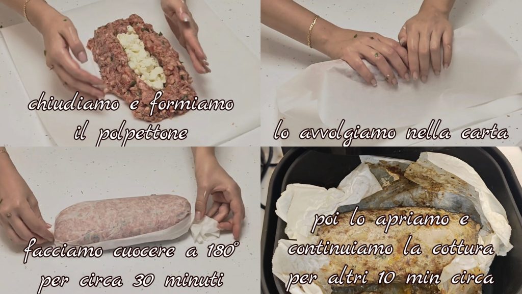 • sluiten en het gehaktbrood vormen. Wikkel het in het papier en bak het in de heteluchtfriteuse op 180° voor ongeveer 30 minuten, open dan het papier en bak nog eens 10 min.