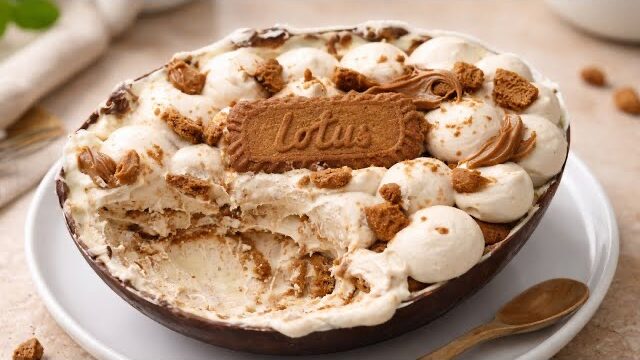 Het gevulde chocolade-ei met Lotus-crème en Lotuskoekjes is een superlekker dessert, perfect voor Pasen en voor alle liefhebbers van de beroemde specerijenkoekjes.