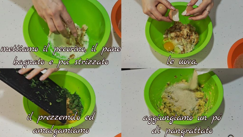 We doen de pecorino, het geweekte brood (in de saus van de mosselen) en vervolgens uitgeknepen, de eieren, de peterselie en mengen alles. We voegen een beetje paneermeel toe om de consistentie aan te passen