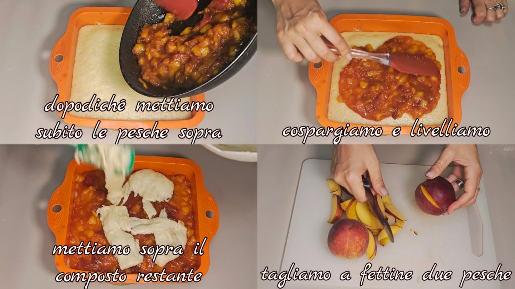 • Na ongeveer 10 minuten halen we het uit de oven en leggen we onmiddellijk het bereide perzikenmengsel erop. We verspreiden en egaliseren. We leggen het resterende mengsel eroverheen en bedekken de hele oppervlakte goed. We nemen twee perziken en snijden ze in plakjes.