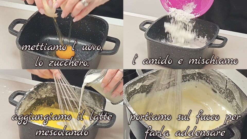 In een pan doen we het ei, suiker, maïszetmeel en mengen. Voeg de melk toe terwijl je roert. Verwarm op het vuur om het in te dikken,roer om te voorkomen dat het aanbrandt. Zodra het is ingedikt, zet het vuur uit en voeg de chocolade toe, meng dan. Overbrengen naar een kom,