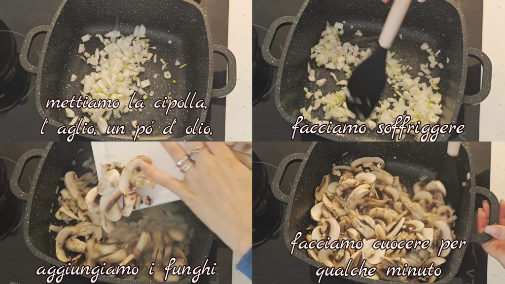 Ten eerste doen we de schoongemaakte, gewassen en gesneden ui en knoflook in een pan. Voeg een beetje olie toe en bak. Doe de gewassen, schoongemaakte en gesneden champignons erin en laat enkele minuten koken.