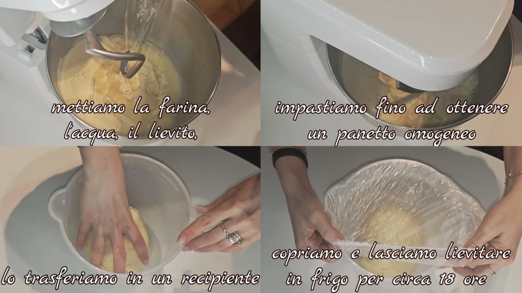 Voorbereiding biga: Voeg de bloem, het water, de gist toe en kneed tot een homogeen deeg. Doe het deeg in een kom, dek het af en zet het ongeveer 18 uur in de koelkast.