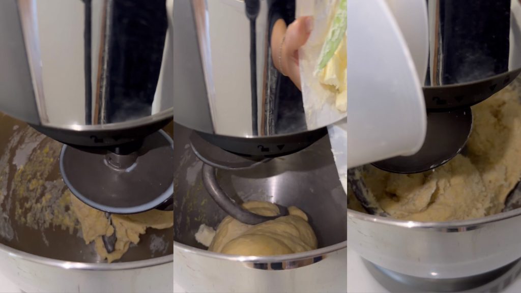 Voeg de boter, de olie en de Parmezaanse kaas toe. Werk het deeg tot het glad en elastisch is.