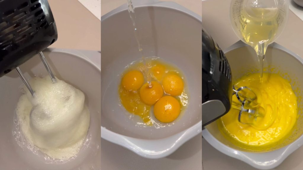 Schei de eiwitten van de dooiers. Klop de eiwitten stijf met een snufje zout. Klop in een andere kom de dooiers met het warme water tot een bleek en schuimig mengsel. Voeg de olie toe