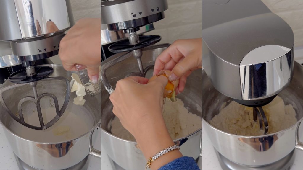 Voeg de boter, het ei toe en kneed snel tot een glad deeg (voeg indien nodig water toe).