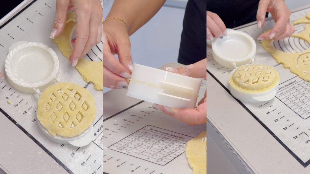 • Leg het andere schijfje bovenop en sluit de vorm door druk uit te oefenen. Verwijder het overtollige deeg en haal het taartje uit de vorm. Ga op dezelfde manier verder met de rest.