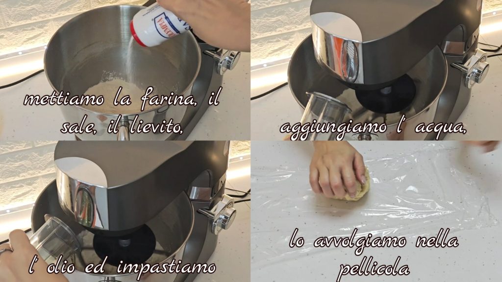 We voegen de bloem, het zout, de gist toe, voegen het water, de olie toe en kneden. We wikkelen het in folie