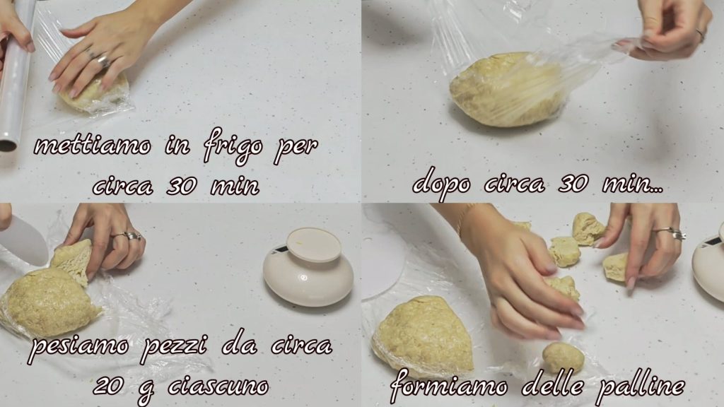 laten we het ongeveer 30 minuten in de koelkast rusten. Na ongeveer 30 minuten wegen we stukjes van ongeveer 20 g elk en vormen we balletjes.
