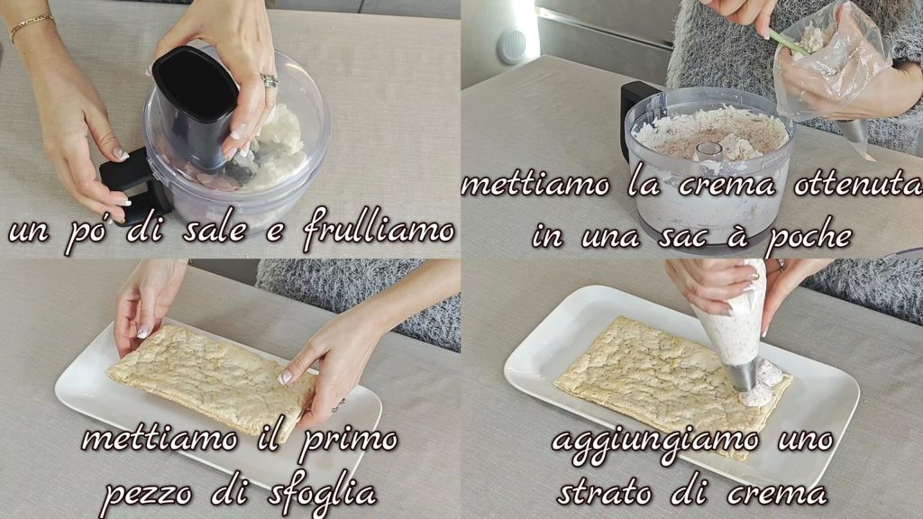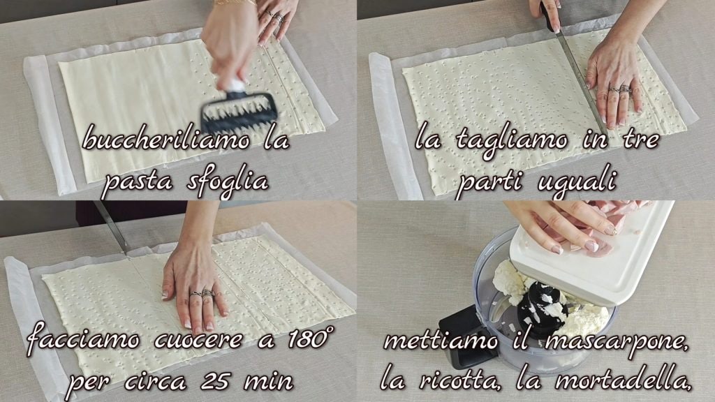 Allereerst rollen we het rolletje bladerdeeg uit en prikken we het in. We snijden het in drie gelijke delen en bakken het dan op 180° gedurende ongeveer 20/30 min. We doen de ricotta, de mortadella, de mascarpone,