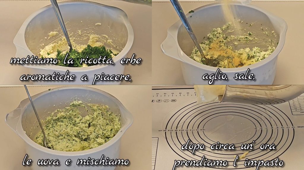 In een kom mengen we de ricotta met de kruiden, de knoflook, het zout en het ei, tot we een homogene crème krijgen.