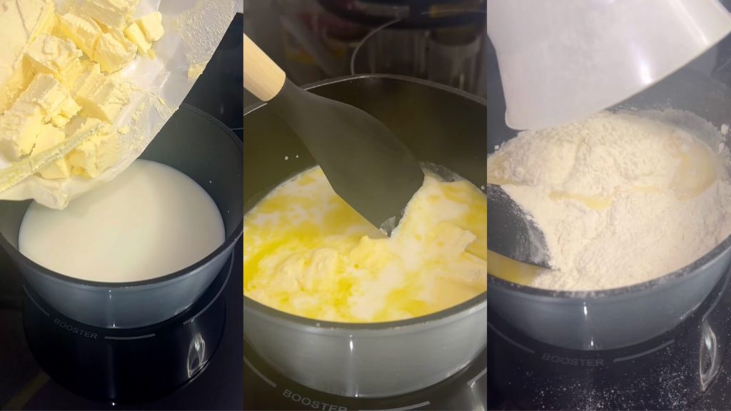 In een steelpan doen we de melk, het water, de boter en een snufje zout. Breng aan de kook. Voeg de bloem in één keer toe