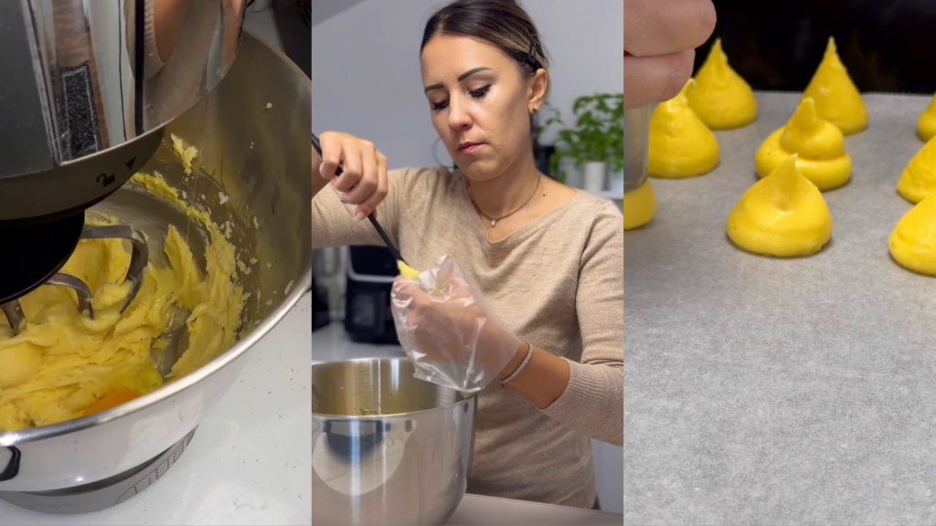 we moeten een glad en romig mengsel krijgen. Doe het deeg in een spuitzak en vorm de soesjes op een met bakpapier beklede bakplaat.