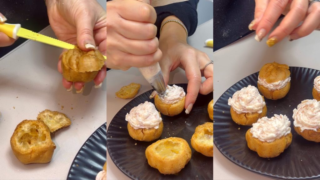 Snijd de afgekoelde soesjes doormidden of maak een klein gaatje aan de onderkant. Vul ze met de crème met behulp van een spuitzak.