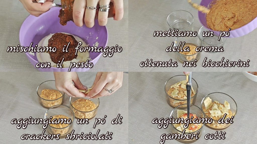 In een kom doen we de zachte kaas (dit kan stracchino, mascarpone, Philadelphia, etc. zijn), de rode pesto en mengen om een homogene crème te verkrijgen. We doen een beetje van de verkregen crème in de glaasjes. Voeg wat verkruimelde crackers toe, gekookte en gepelde garnalen