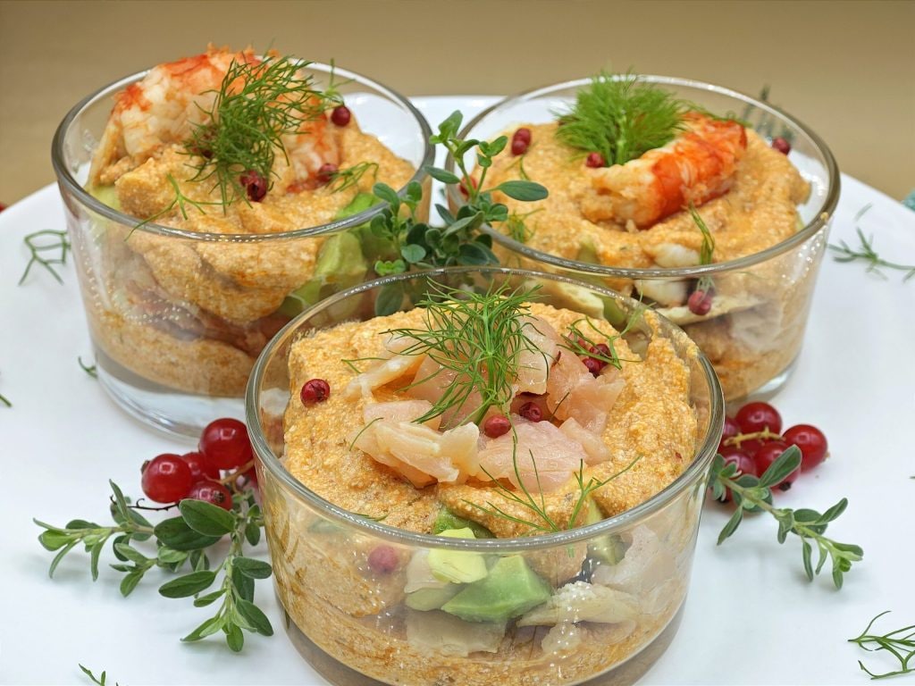 of gerookte zalm, een beetje avocado in stukjes gesneden, een beetje crème, nog een beetje garnalen en zalm