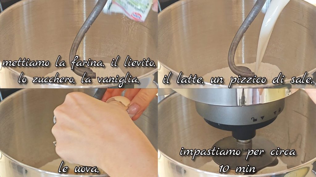 Doe in een kom bloem, gist, suiker, vanille, melk, zout en eieren.