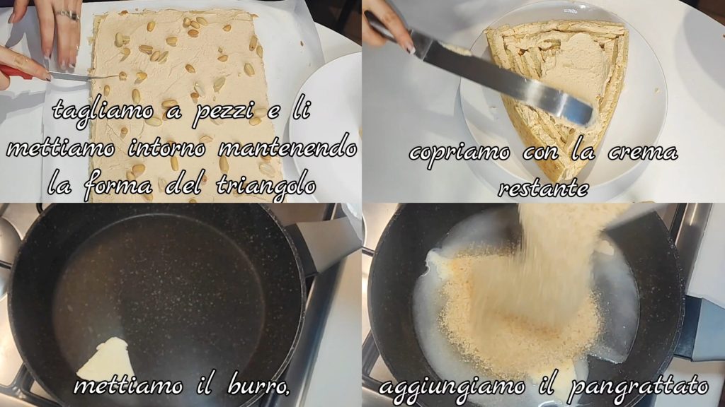 We snijden de andere stroken in stukken en plaatsen ze eromheen, behoudend de driehoekvorm. We bedekken het hele oppervlak met de resterende crème. We smelten de boter en voegen het paneermeel toe.