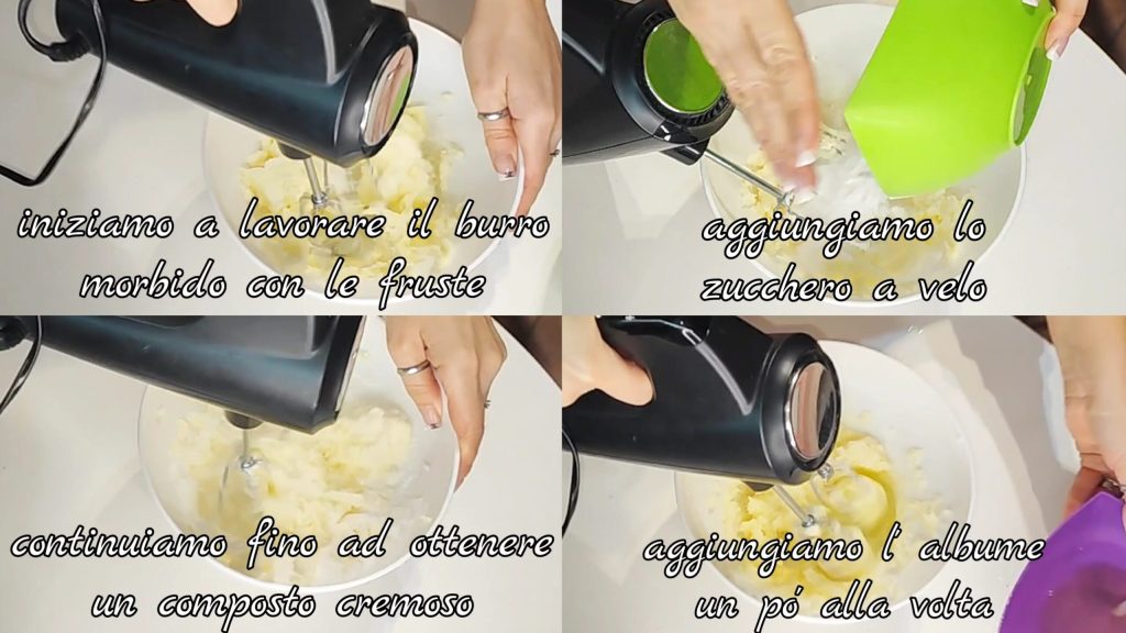 We beginnen met het kloppen van de zachte boter (op kamertemperatuur) met de elektrische mixer of door de planeetmenger te gebruiken. We voegen de poedersuiker toe en gaan door tot we een romige massa hebben. We doen de eiwitten beetje bij beetje erbij zonder de mixer uit te zetten.