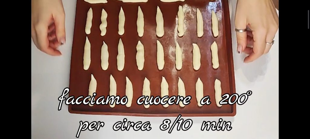 We voegen ook beetje bij beetje de bloem toe en mengen goed. Tot slot voegen we een beetje vanille toe en gieten we het verkregen mengsel in een spuitzak met een gladde tuit van 10 mm. We vormen strepen die min of meer dezelfde vorm en grootte hebben.