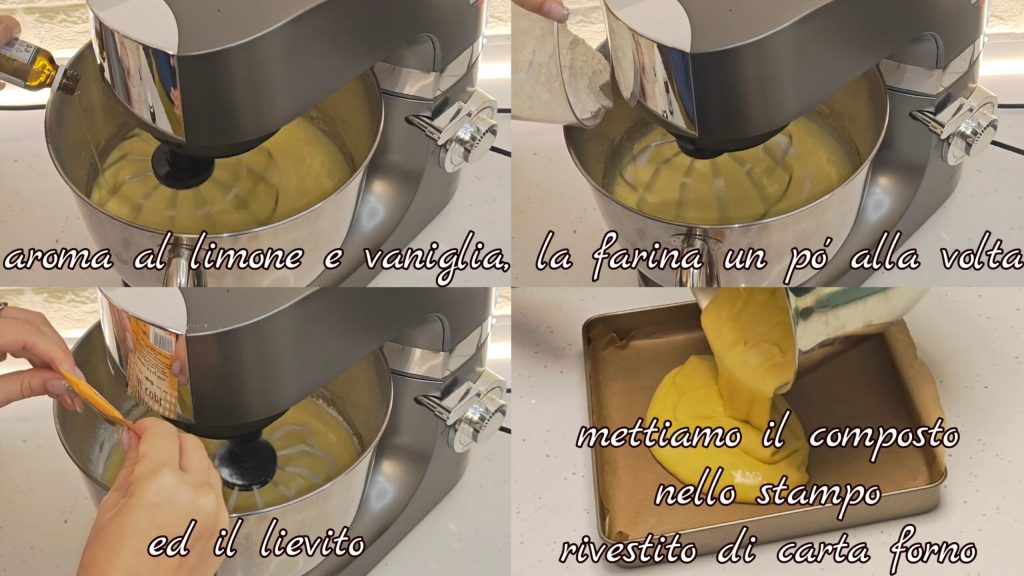 Voeg een beetje citroenaroma of schil en vanille toe. Voeg beetje bij beetje de bloem en het bakpoeder toe. Doe het verkregen mengsel in de vorm (27×27 cm) bekleed met bakpapier