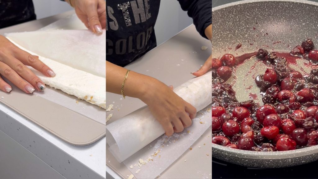 Een basis van luchtige en opgerolde meringue, gevuld met slagroom en krieken, die knapperigheid en romigheid combineert in één spectaculair dessert.