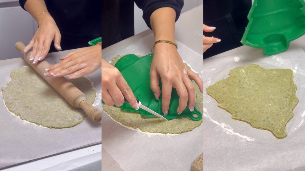 Rol het deeg uit een stuk per keer en snijd de vormen van de boom uit.
