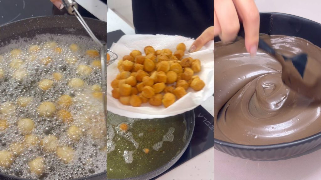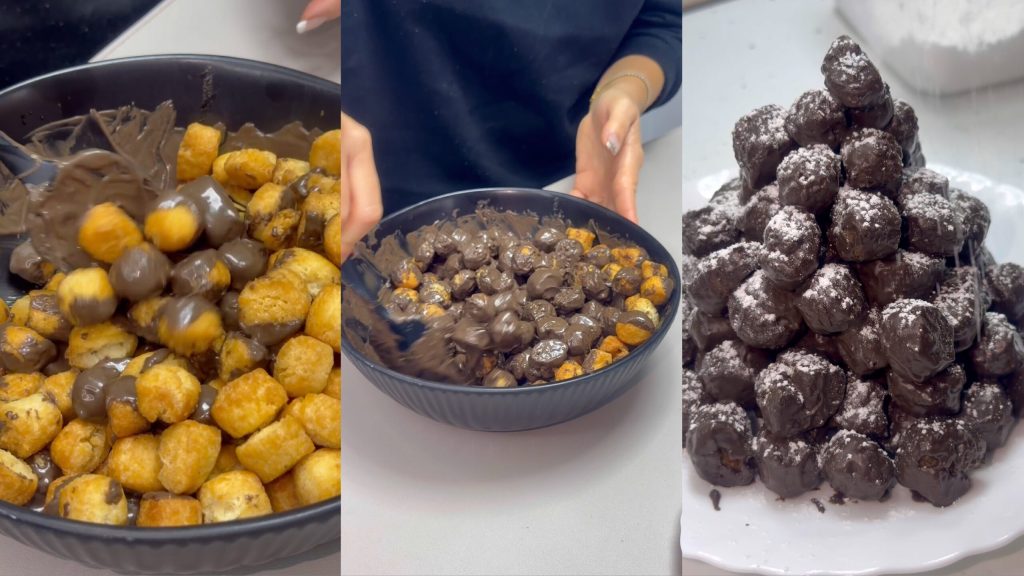 Giet de gefrituurde struffoli in de gesmolten chocolade en meng voorzichtig tot ze bedekt zijn.