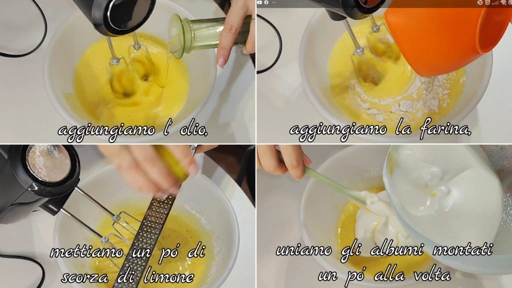 We voegen de olie, de bloem en een beetje citroenschil toe en mengen goed. Voeg het opgeklopte eiwit geleidelijk toe met zachte bewegingen van onder naar boven.
