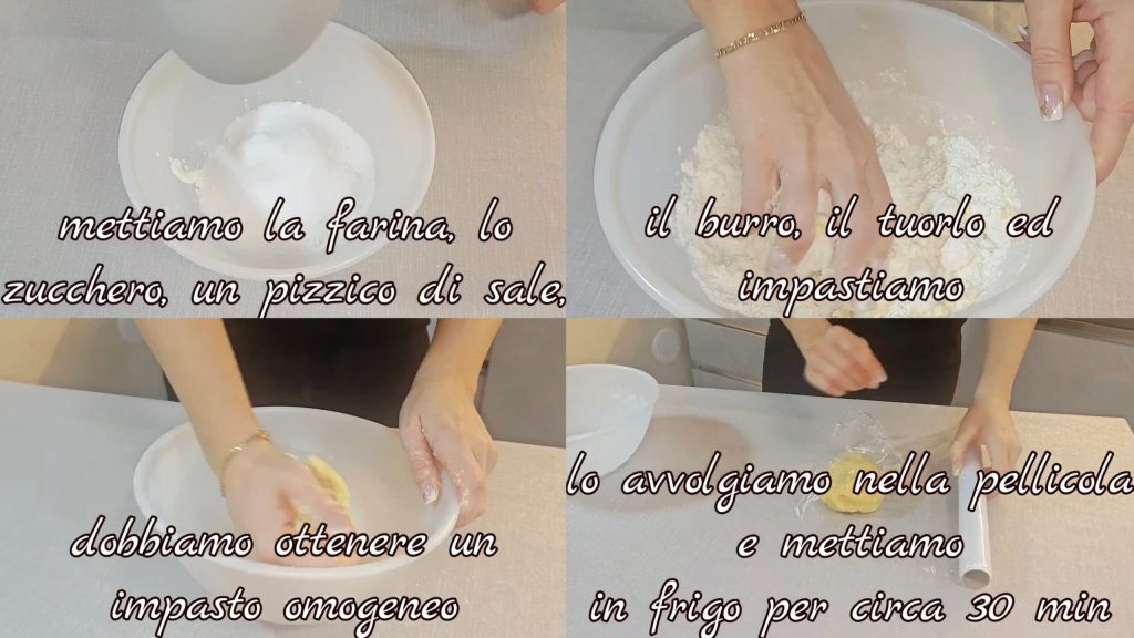 In een kom doen we de bloem, de suiker, een snufje zout, de boter, de eidooier en kneden. We moeten een homogeen deeg krijgen. We wikkelen het in huishoudfolie en leggen het ongeveer 30 minuten in de koelkast.