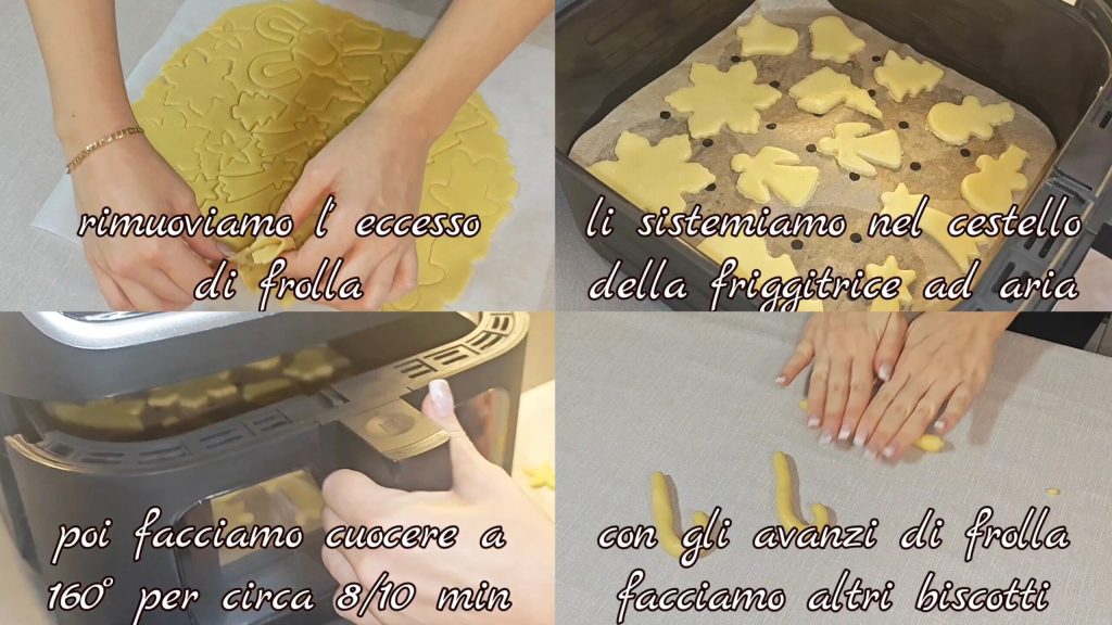 We verwijderen het overtollige deeg en leggen ze vervolgens in het mandje van de airfryer met het bakpapier erin. We bakken ze op 160° voor ongeveer 8/10 minuten. Met de restjes deeg maken we meer koekjes.