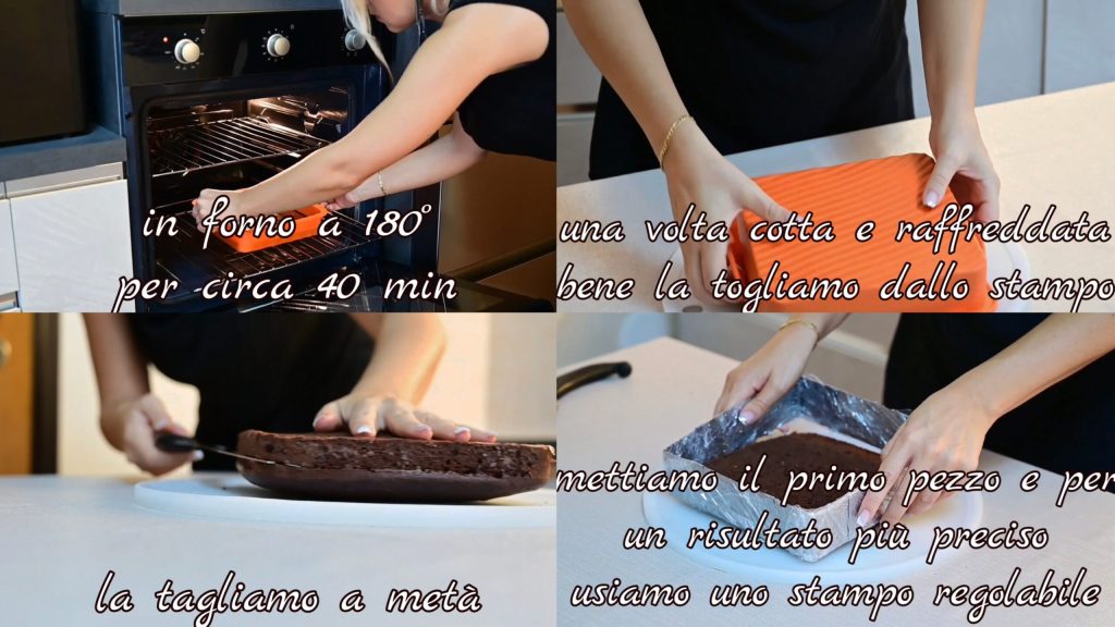 We bakken het op 180° ongeveer 40 minuten. Als het gaar is, laten we het goed afkoelen, dan verwijderen we de vorm en snijden we het doormidden. We plaatsen het eerste stuk en voor een preciezer resultaat gebruiken we een verstelbare vorm.