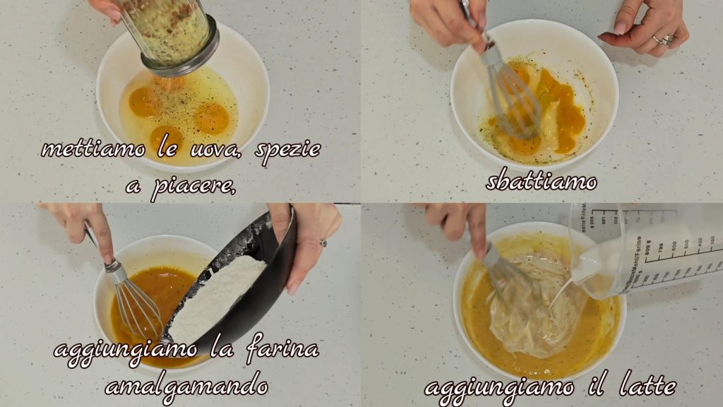 In een kom doen we de eieren, kruiden naar smaak en kloppen met een garde. We voegen beetje bij beetje de bloem toe en roeren goed. Voeg de melk toe en meng om een klontvrij mengsel te verkrijgen.