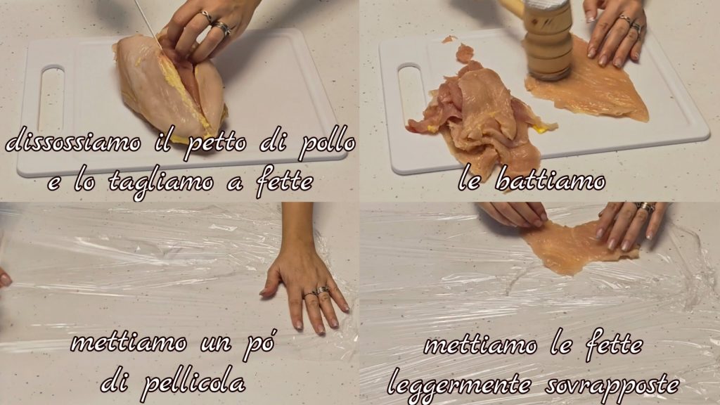 Allereerst ontbenen we de kipfilet en snijden we deze in plakken. We slaan ze plat met een vleeshamer en leggen ze vervolgens in een rij licht overlappend op het plasticfolie.