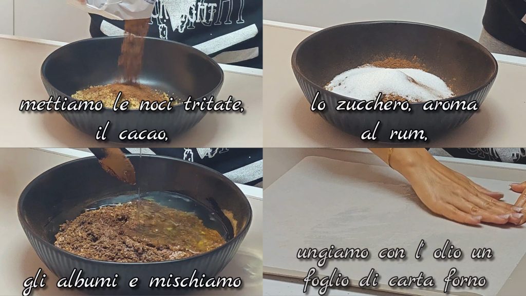 Doe de gehakte walnoten, cacao, suiker en rumaroma in een kom en meng goed.