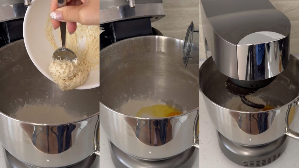 In een grote kom (of in de staande mixer) voeg het voordeeg, de bloem, het water, het ei en de dooier samen. Begin te kneden totdat de vloeistoffen zijn opgenomen.
