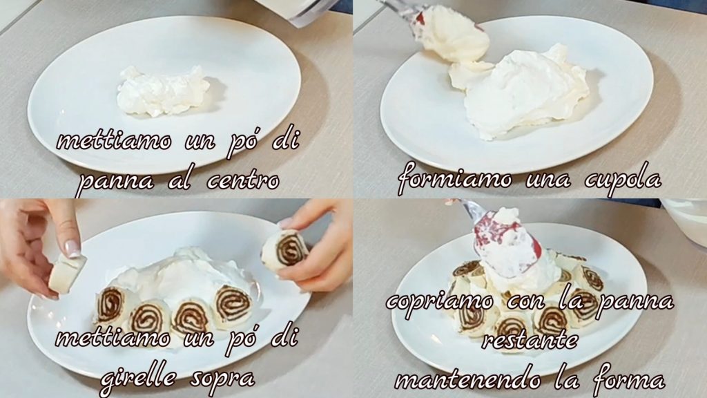 Leg een beetje slagroom in het midden van het bord (ongeveer de helft) om een koepel te vormen. Voeg daarbovenop wat rolletjes toe. Doe de overige room erop en behoud de koepelvorm.