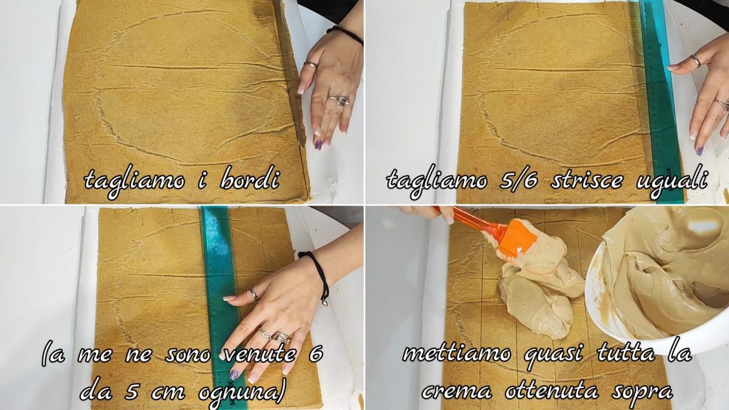 Pak de koude basis, snijd de randen en snijd vervolgens 5/6 gelijke repen (ik kreeg 6 repen van 5 cm elk). Leg bijna alle verkregen room erop.