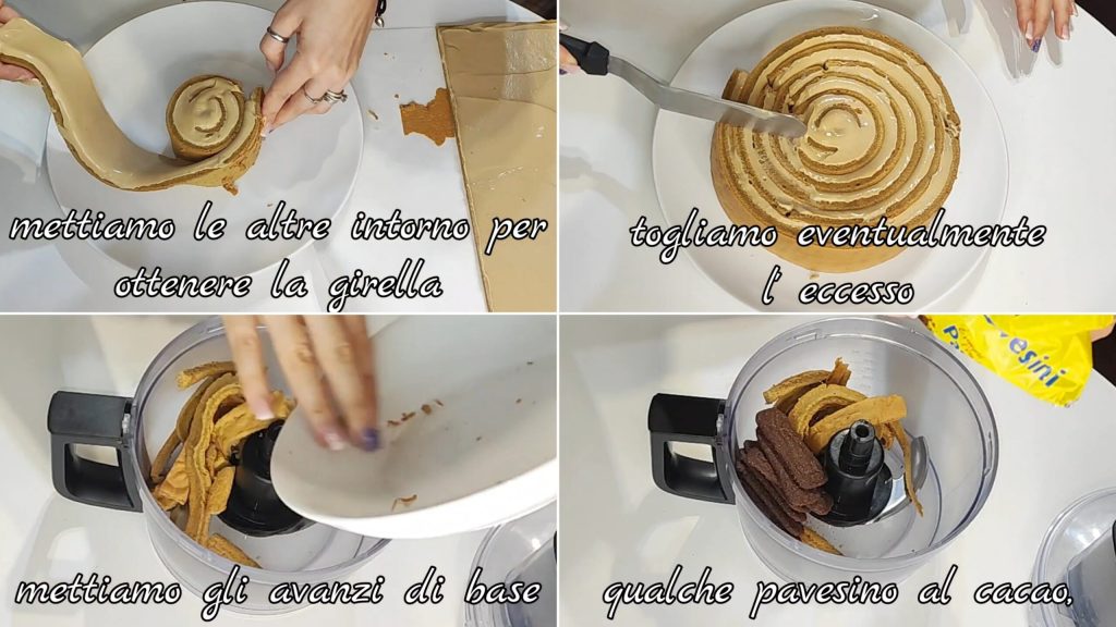 Plaats de andere repen eromheen om de spiraal te vormen! Verwijder indien nodig de overtollige room. Voeg de restjes van de randen en wat cacao pavesini of koekjes toe.