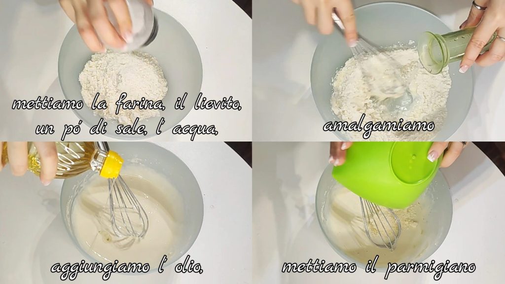 In een kom voegen we de bloem, het bakpoeder, een beetje zout, het water beetje bij beetje toe en mengen goed om klontjes te voorkomen. Voeg de olijfolie, Parmezaanse kaas toe en meng.