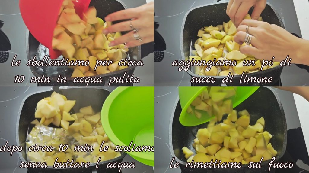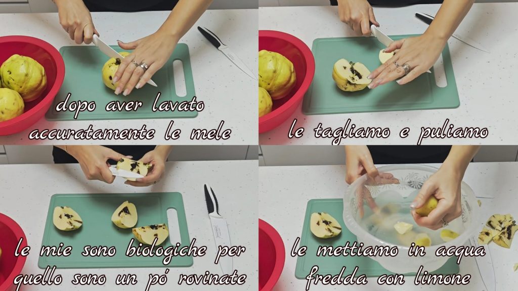 Allereerst moeten we de kweeperen grondig wassen met een schuurponsje om de beharing te verwijderen. We snijden en reinigen ze door het binnenste en eventuele blauwe plekken of beschadigde delen te verwijderen (mijn kweeperen waren biologisch en dus behoorlijk beschadigd). We zetten ze in koud water met citroen om te voorkomen dat ze bruin worden.