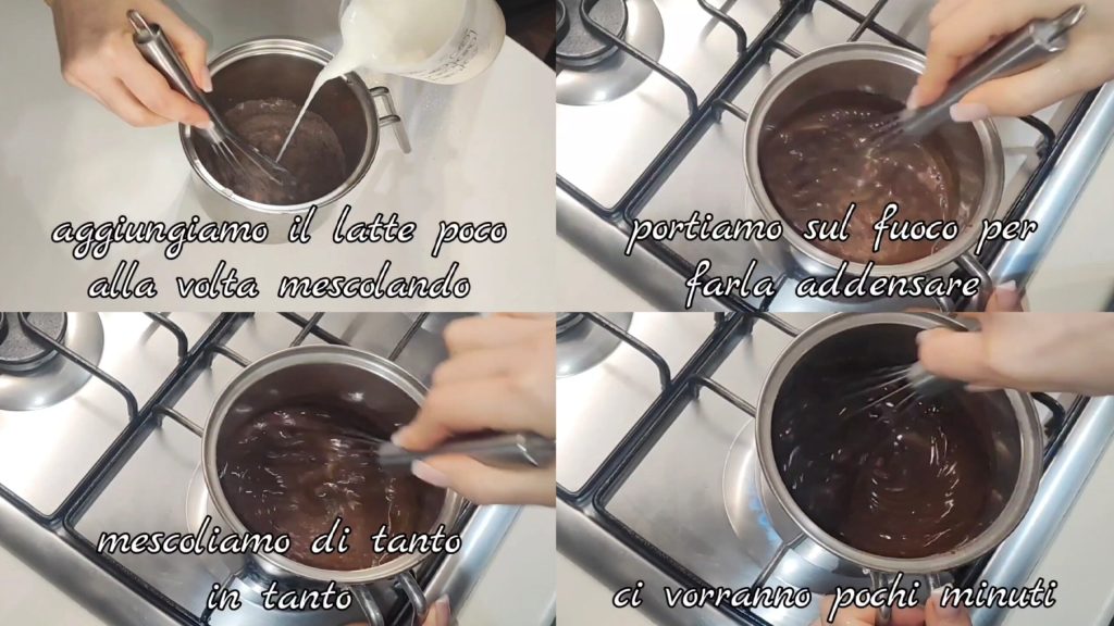 Voeg de melk beetje bij beetje toe al roerend. Zet op het vuur om het in te dikken terwijl je blijft roeren. Dit duurt enkele minuten.