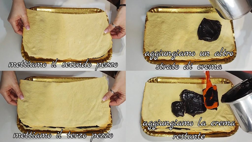Leg het tweede stuk zanddeeg, een andere laag room, het derde stuk zanddeeg en bedek dan met de resterende room.