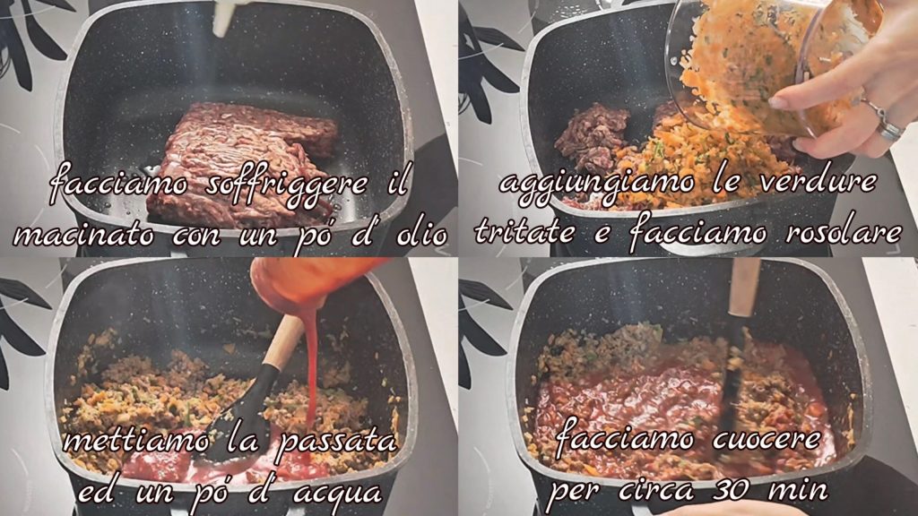 In een pan fruiten we het gehakt aan met een beetje olie, voegen we de fijngehakte/grofgemalen groenten toe en laten we het bruin worden. We voegen de passata en een beetje water toe en laten het ongeveer 30 minuten koken, af en toe roerend.
