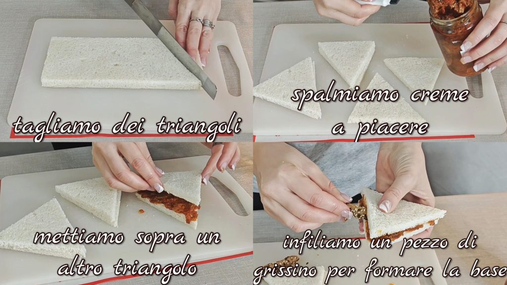 We nemen de sneetjes witbrood en snijden ze om driehoeken te maken. We smeren er hartige crèmes naar keuze op en bedekken met een andere driehoek van witbrood. We steken een stuk soepstengel in het midden om de basis te vormen.