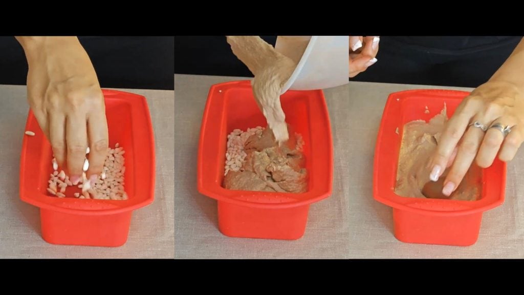 Leg een beetje gepofte rijst op de bodem van de vorm (bij voorkeur siliconen, anders gebruik je folie om later gemakkelijker uit de vorm te halen na het invriezen). Voeg ongeveer de helft van de room toe, een paar chocolaatjes,